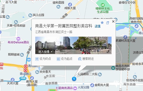 青山客运站610米向东步行 到 阳明东路西口1站乘 2路 (火车站东广场方向) 或 6路12路 209路 到 南大一附医院北门400米向东南步行 到 南昌大学第一附属医院-整形美容科