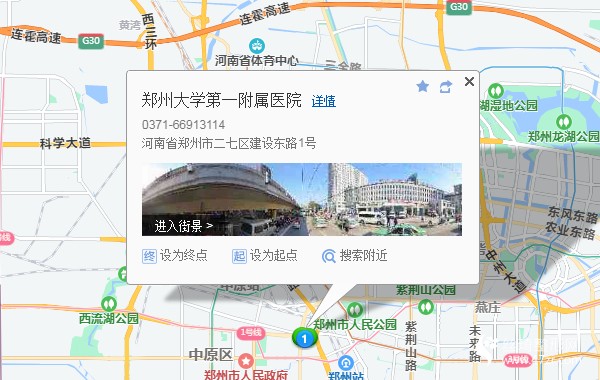 郑州客运南站150米向西南步行 到 汽车客运南站2站乘 Z318路 (火车站南港湾方向) 到 火车站西广场450米向东步行 到 郑州火车站 C口 进站1站乘 地铁1号线 (河南工业大学方向) 到 医学院 B口 出站850米向北步行 到 郑州大学第一附属医院