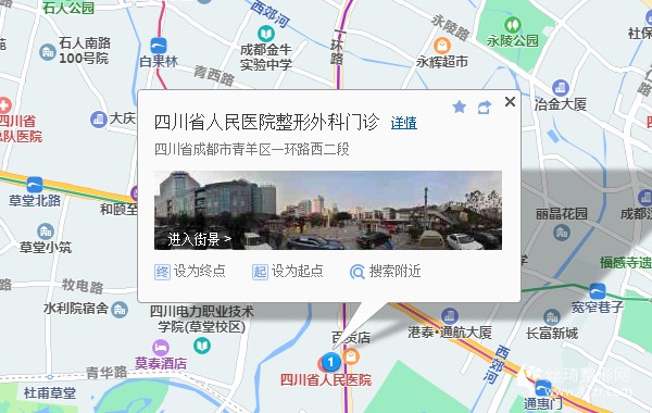 成都站90米向西步行 到 火车北站 H口 进站1站乘 地铁1号线 (科学城方向) 到 人民北路220米向东步行 到 人民北路1站乘 地铁6号线 (望丛祠方向) 到 西北桥3站乘 地铁5号线 (回龙方向) 到 中医大省医院 G口 出站440米向南步行 到 四川省人民医院整形外科门诊