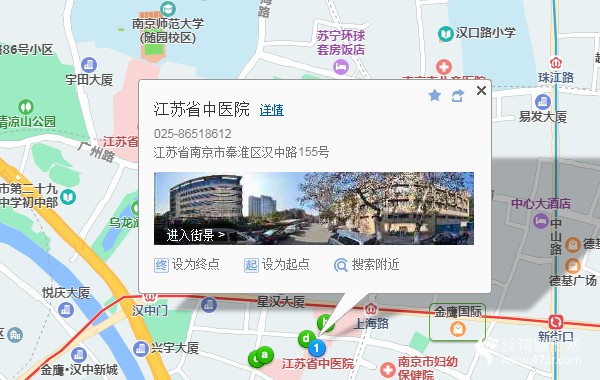 南京站1.4公里向北步行 到 南京站 11口 进站5站乘 地铁1号线 (中国药科大学方向) 到 新街口 20口 出站850米向西步行 到 江苏省中医院