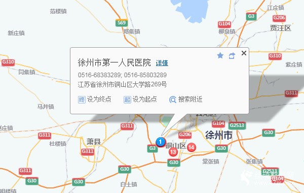 徐州站1.4公里向南步行 到 宣武市场南门19站乘 837路附 (白虎山方向) 到 桥上菜市场960米向北步行 到 徐州市第一人民医院
