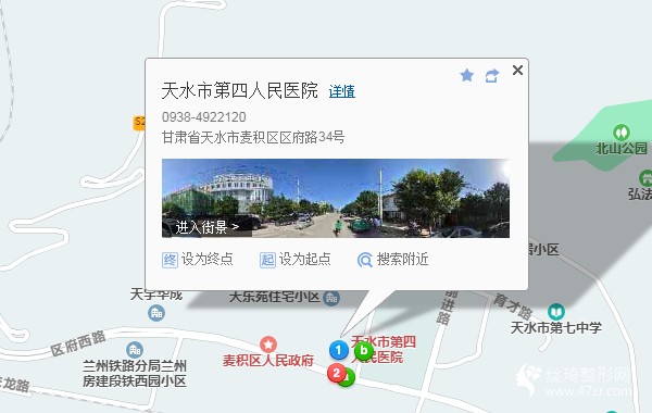 天水南站710米向东北步行 到 天水南站11站乘 1路 (麦积公交总站方向) 到 天水火车站900米向西北步行 到 天水市第四人民医院