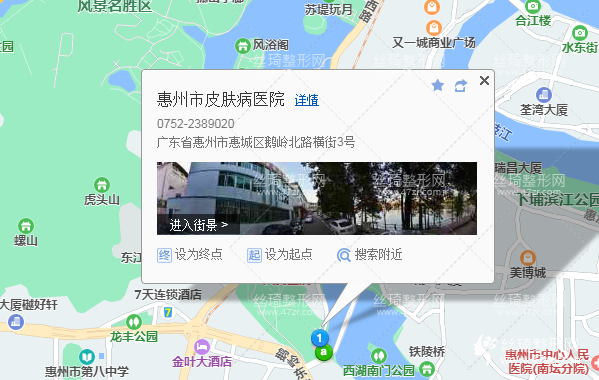惠州市皮肤病医院医疗美容中心是经市机构编制委员会批准成立的市卫生和计划生育局直属的事业医疗单位。位于鹅岭北路横街2号,内设停车场,交通便利,是惠州市仅有的一家市级皮肤、性病专科非营利性公立医院,承担全市皮肤病、性病防治。拥有一批经过培训、技术精湛的医务人员,其中正主任医师3名,副主任医师15名,主治医师7名,硕士研究生医师6名,医学博士1名,技术力量雄厚。