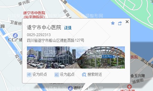 3、遂宁市汽车中心站180米向东步行 到 火车站12站乘 19路 (城南客运站方向) 到 育才西路640米向南步行 到 遂宁市人民医院。