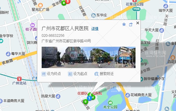广州站180米向东步行 到 广州火车站 D3口 进站8站乘 地铁2号线 (嘉禾望岗方向) 到 嘉禾望岗3站乘 地铁3号线北延线 (机场北(2号航站楼)方向) 到 高增2米向东步行 到 高增6站乘 地铁9号线 (飞鹅岭方向) 到 花果山公园 C口 出站360米向东步行 到 购书中心5站乘 花75路A线 (雅瑶公交总站方向) 到 新华市场230米向东南步行 到 广州市花都区人民医院