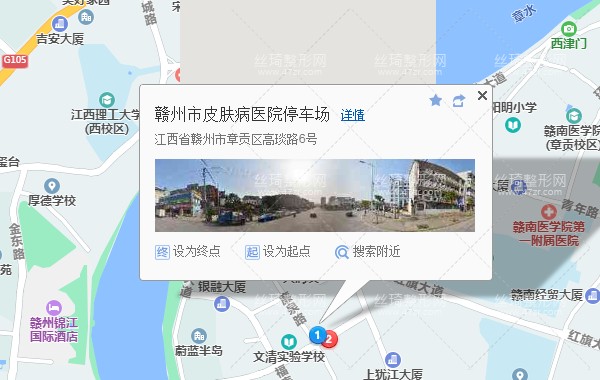 赣州站490米向西北步行 到 站前大道北10站乘 9路 (赣南妇婴医院方向) 到 文清实验学校330米向东步行 到 赣州市皮肤病医院