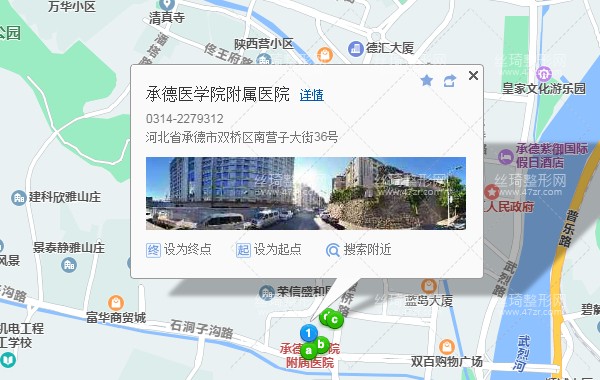 承德站300米向东南步行 到 福隆小区4站乘 902路 (漫子沟村方向) 或 13路 到 南互通枢纽站180米向东步行 到 南互通枢纽站8站乘 39路 (水泉沟村方向) 到 附属医院南院390米向南步行 到 承德医学院附属医院