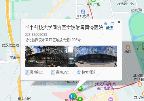 武汉站60米向东北步行 到 武汉火车站 出入口进站11站乘 轨道交通4号线 (柏林方向) 到 洪山广场6站乘 轨道交通2号线 (天河机场方向) 到 中山公园 D口 出站160米向东步行 到 解放大道中山公园2站乘 712路 (天顺园公交场站方向) 或548路 508路 1路 电3路 549路 到 解放大道同济医院240米向东步行 到 武汉同济医院整形科