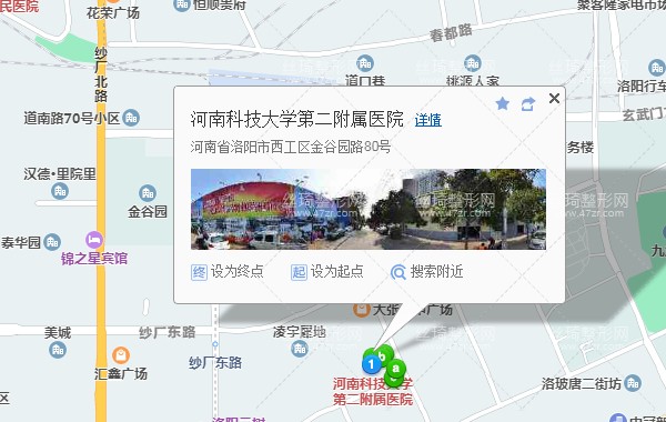 洛阳站310米向东南步行 到 金谷园路春晴路口1站乘 201路 (龙门公路客运中心方向) 或 48路 5路 1路 到 金谷园路健康东路口40米向东南步行 到 河南科技大学第二附属医院。