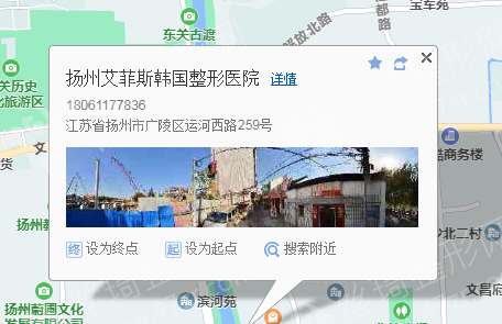 扬州东站590米向西南步行 到 东部客运枢纽11站乘 108路 (华扬西路润扬南路方向) 或 87路 到 大水湾公园460米向西北步行 到 扬州艾菲斯韩国整形医院。