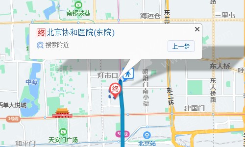 北京站510米向北步行 到 建国门 C口(西南口)进站2站乘 地铁1号线 (古城方向) 到 王府井A口(东北口) 出站990米向东北步行 到 北京协和医院(东院)
