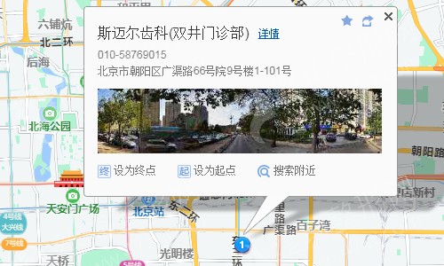 北京站110米向西步行 到 北京站 C东南出口 进站1站乘 地铁2号线外环 (建国门方向) 到 建国门90米向东步行 到 建国门2站乘 地铁1号线 (四惠东方向) 到 国贸230米向东步行 到 国贸1站乘 地铁10号线内环 (双井方向) 到 双井 H口(西南口) 出站750米向南步行 到 斯迈尔齿科(双井门诊部)