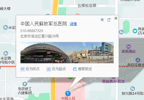 北京站510米向北步行 到 建国门 C口(西南口)进站12站乘 地铁1号线 (古城方向) 到 五棵松C1口(东南口) 出站230米向东步行 到 中国人民解放军总医院