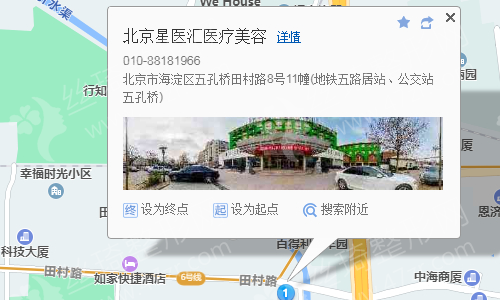 北京星医汇医疗美容门诊部,成立于2017年7月21日,地处北京海淀区五孔桥田村路8号11栋,交通便利,占地3000多平方米,是一所集整外管理中心、脂肪管理中心、皮肤管理中心、抗衰老管理中心为一体的医疗美容机构。星医汇医美,是经北京市海淀区计划和生育委员会审批成立的正规医疗美容机构,是绿宝石严选医美机构、伊婉指定授权机构等。诊疗科目有医疗美容外科、美容牙科等。具体开设有眼部精细整形、肋软骨隆鼻、鼻翼缩小、大腿吸脂、全身吸脂等,其中特色项目之一CHA魅力马甲线整形术,因注重个体差异化,按照腹直肌的结构进行个性化、精细化塑形AB线,让腹部呈现迷人的马甲线而获得肯定。