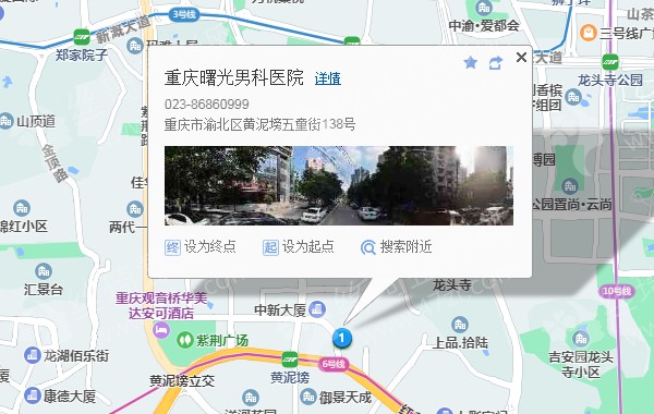 重庆站570米向北步行 到 两路口 5口 进站3站乘 轨道交通1号线 (朝天门方向) 到 小什字300米向东步行 到 小什字5站乘 轨道交通6号线 (北碚方向) 到 黄泥塝 1A口 出站250米向东步行 到 重庆曙光男科医院