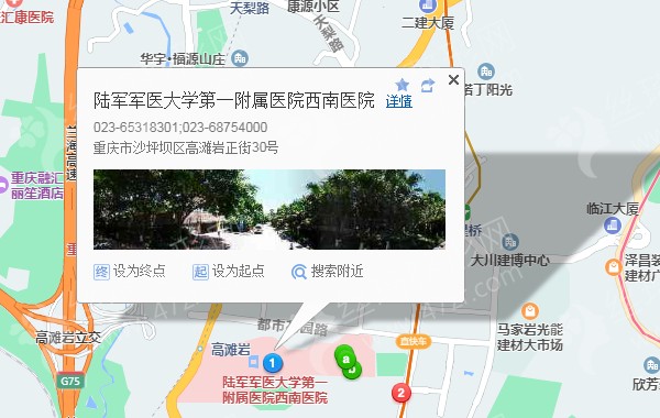 重庆站550米向北步行 到 两路口 5口 进站7站乘 轨道交通1号线 (璧山方向) 到 马家岩 1B口 出站1.8公里向西南步行 到 陆军军医大学第一附属医院西南医院