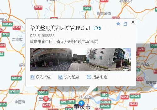 重庆北站50米向西步行 到 重庆北站南广场 6口进站8站乘 轨道交通3号线 (鱼洞方向) 到 牛角沱 2口 出站880米向东步行 到 华美整形美容医院